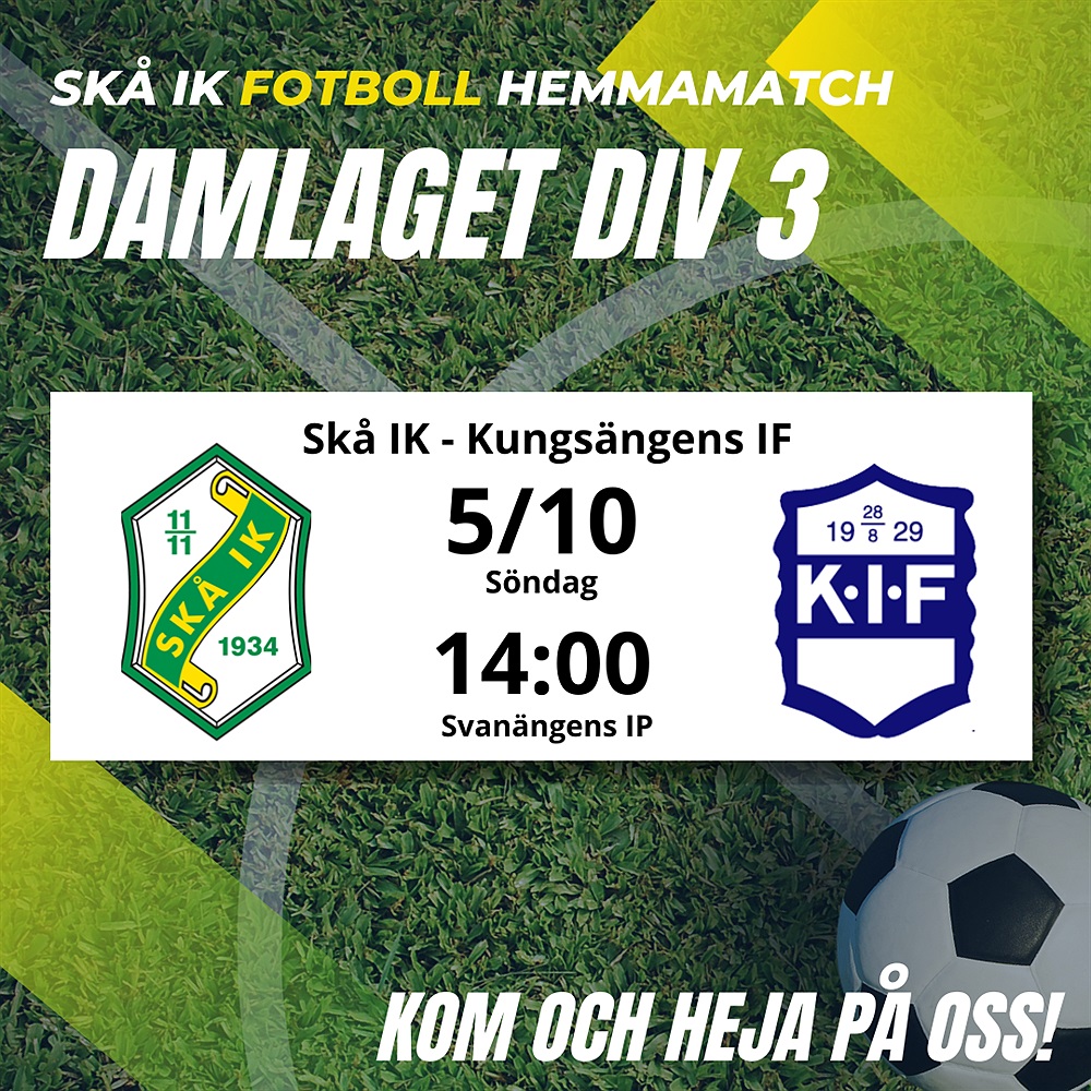 Nu på söndag den 5 oktober spelar vårt Damlag sin sista hemmamatch för säsongen på Svanängens IP i division 3A. Motståndet står Kungsängens IF för – och vi behöver stöd från läktaren! 💛💚