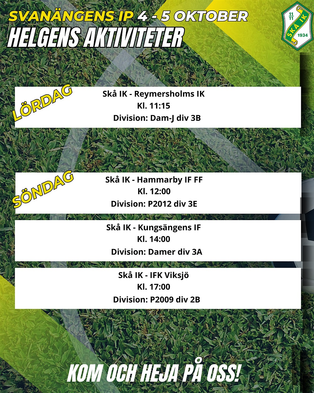 Här kommer helgens hållpunkter på Svanängens IP – en plats full av fotboll, gemenskap och glädje! ⚽💛💚 Se bild för hela schemat.