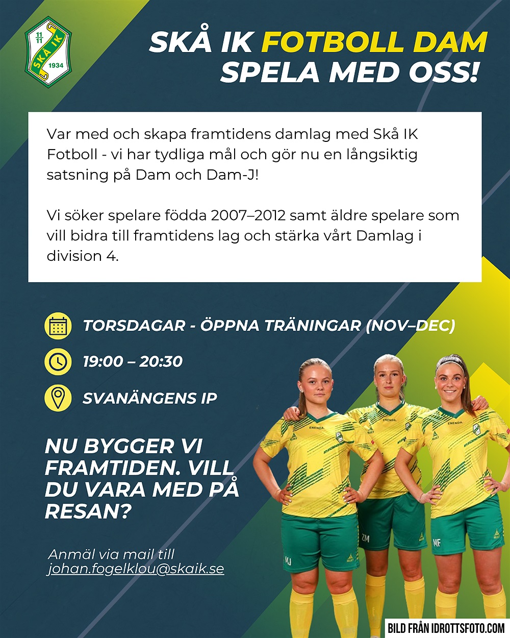 Skå IK Fotboll tar steg framåt och gör en ambitiös satsning på Dam-J, riktad till spelare födda 2007–2012 – men också till äldre spelare som vill vara med och bygga något långsiktigt och bli en stomme i vårt Damlag i division 4.